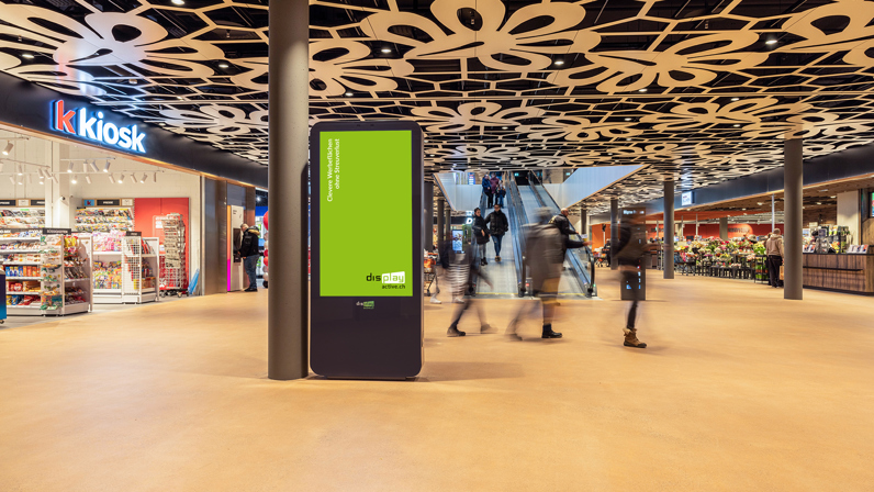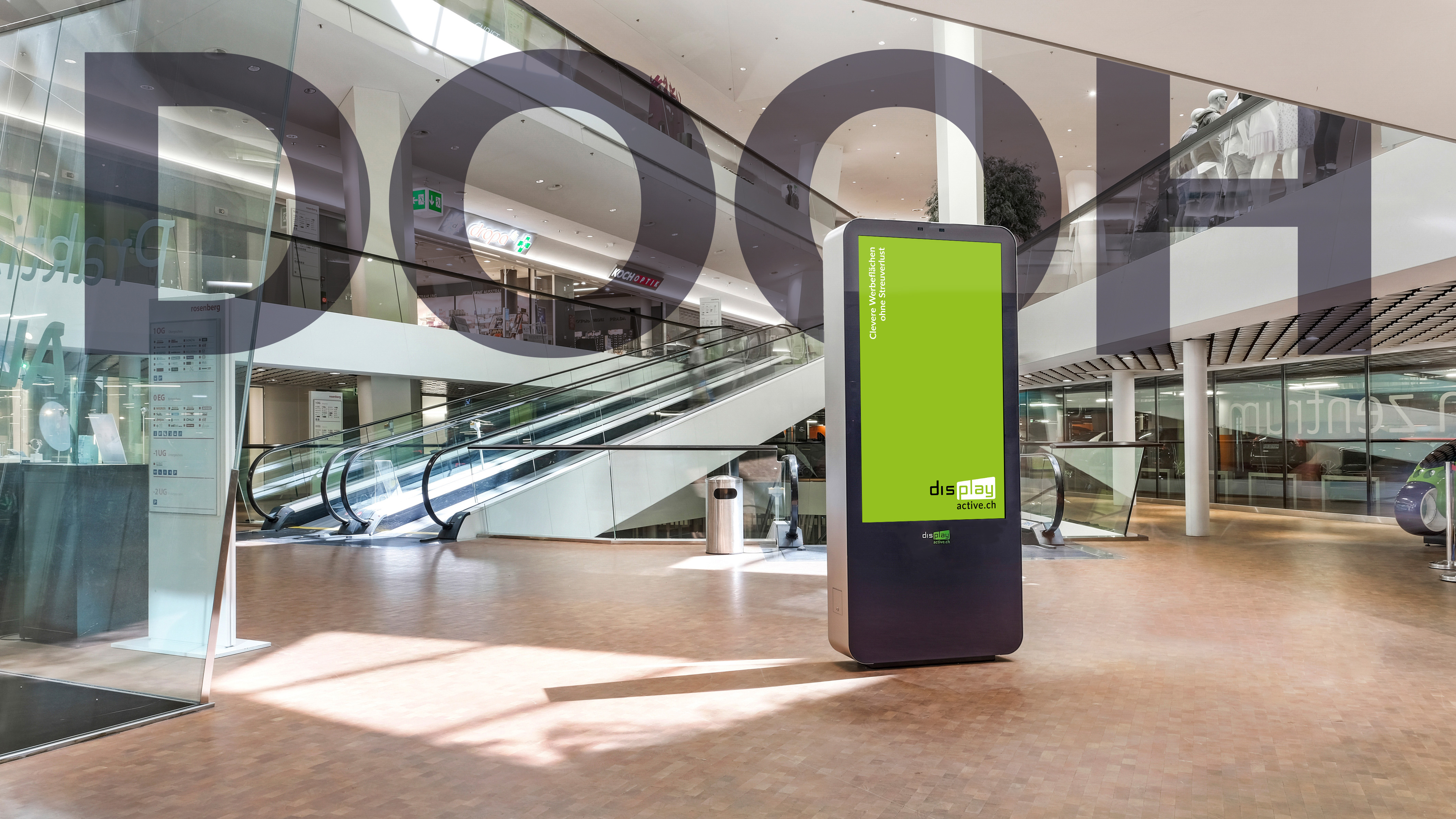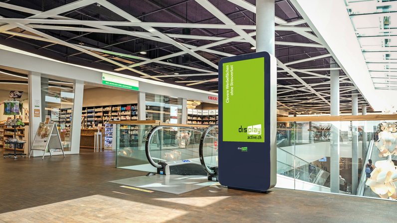 Digitale Werbeflächen in Einkaufszentren – mitten im Kaufmoment und direkt im Konsumumfeld der Kundschaft. Ideal für die Platzierung von Markenbotschaften unmittelbar vor dem Point of Sale.